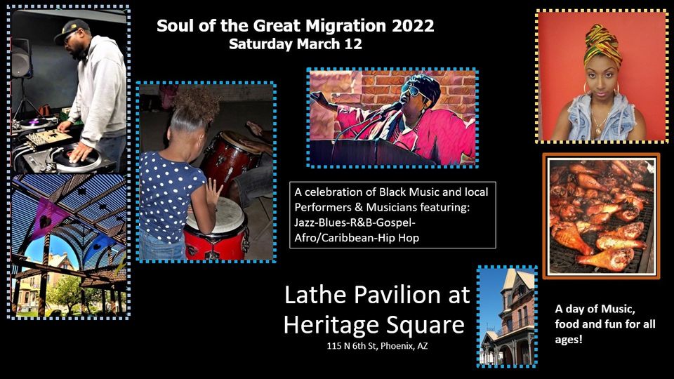 Free, all-day festival to celebrate Black History Month in conjunction to The Great Migration exhibit at Heritage Square. Featuring African drummers, gospel singers, traditional Cuban music, fantastic local DJs, and Arizona’s King of the Blues, Big Pete Pearson with the True Flavor Blues Band. Organized by Clottee Hammons.